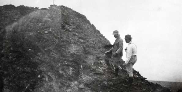 Frank Perret (left) and Thomas Jaggar examine Cone Crater, Kilauea southwest rift zone, during a return visit by Perret in 1914. (Photo courtesy of HVO)