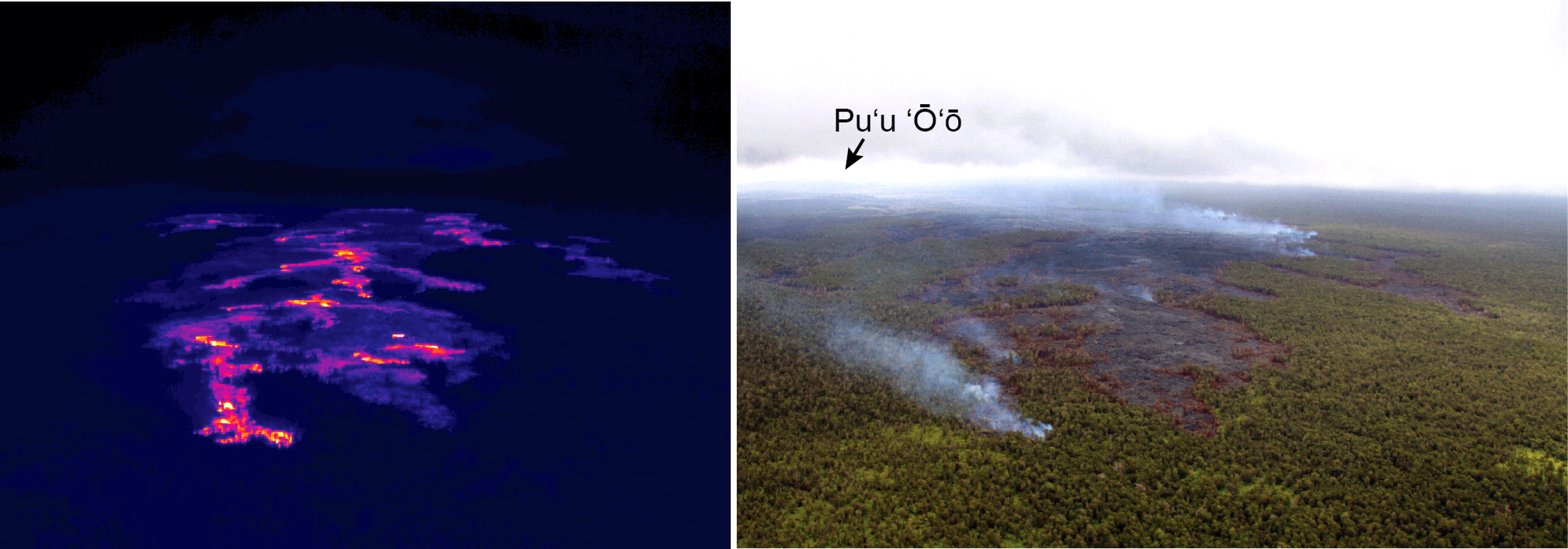 A comparison of a thermal image (left) with a normal photograph (right) of the Kahaualeʻa 2 flow front. Brighter colors in the thermal image depict hotter surface temperatures, with white and yellow areas showing active pāhoehoe breakouts. These breakouts are distributed in a scattered fashion across this portion of the flow field. The vent for the Kahaualeʻa 2 flow is on Puʻu ʻŌʻō, visible in the upper left of the photograph. Photo courtesy of USGS/HVO