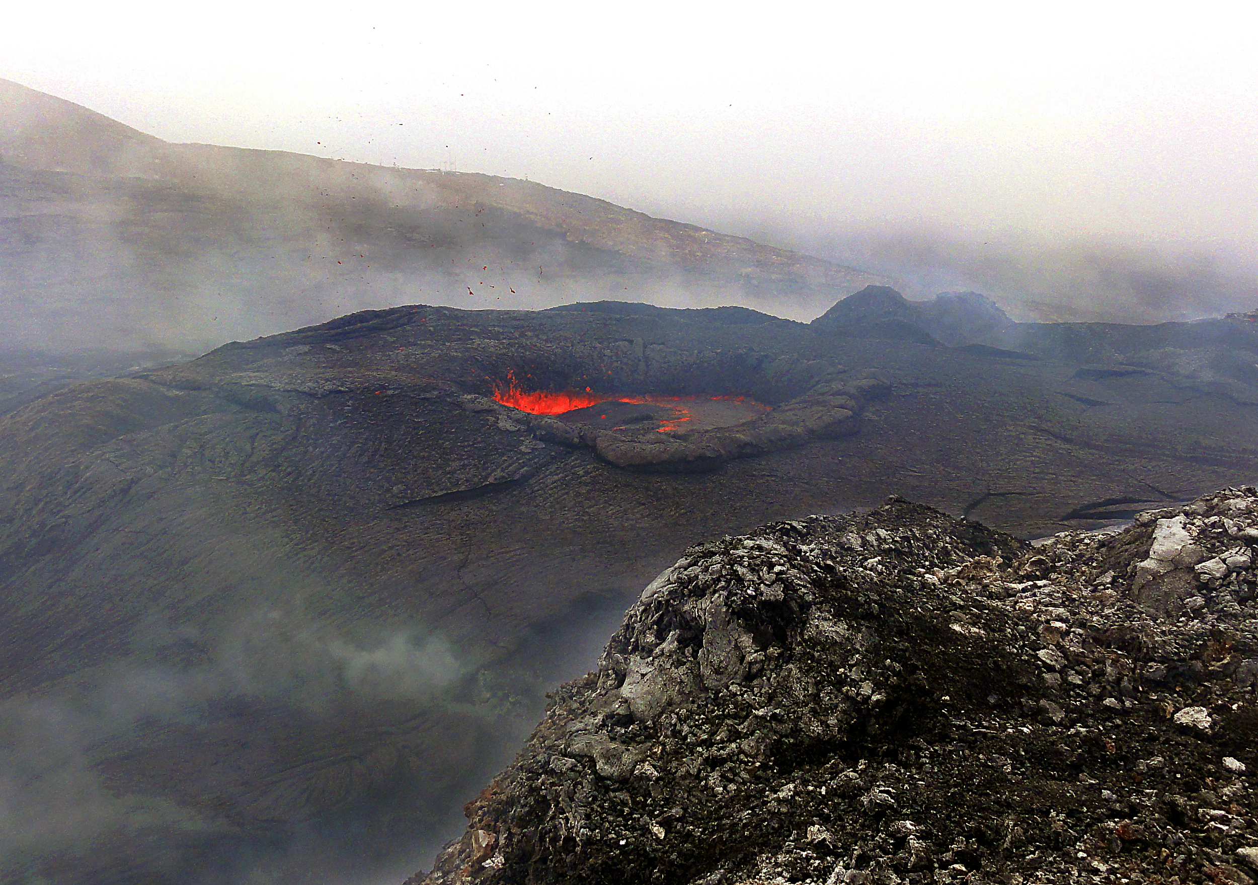 A view of Puʻu ʻŌʻō crater from the north, looking southeast. In the foreground, the crater rim has red hues due to oxidized cinder and spatter from the early days of Puʻu ʻŌʻō in the 1980s. In the center of the photograph, the black crater floor consists of lava flows erupted in the last several years, with several spatter cones built upon these flows. Near the left edge of the photograph, a small perched lava pond has been active in recent months. Photo courtesy of USGS/HVO