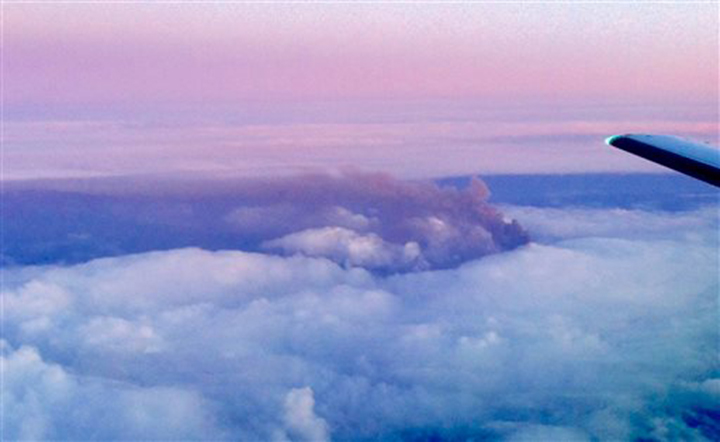 In this photo taken Friday by the Alaska Volcano Observatory, the Pavlof volcano's eruption plume is seen from an aircraft. The National Weather Service warned airplanes to avoid airspace near the erupting volcano as it spewed ash 30,000 feet above sea level.