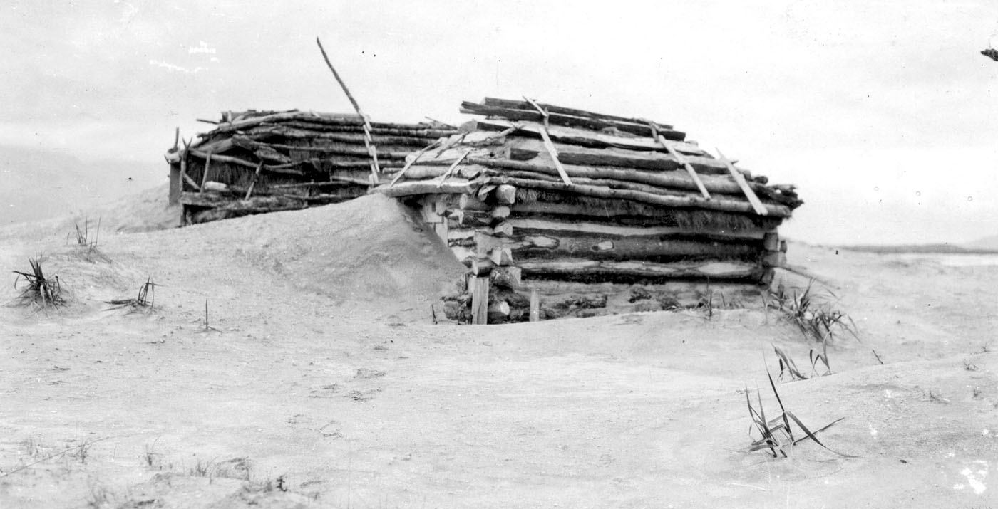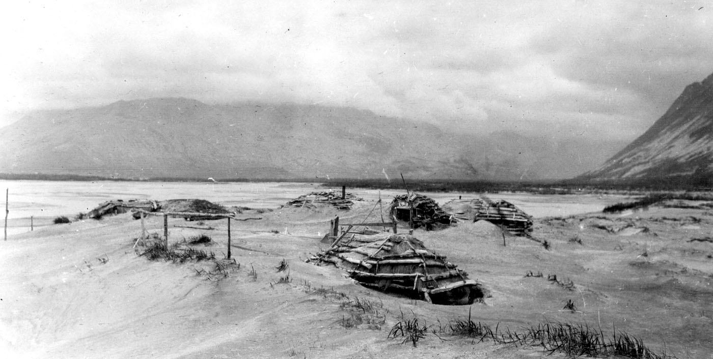 Katmai National Park and Preserve, Alaska. Ash drifts around houses at Katmai after the June 1912 eruption of Novarupta Volcano. August 13, 1912. Photo courtesy of USGS.
