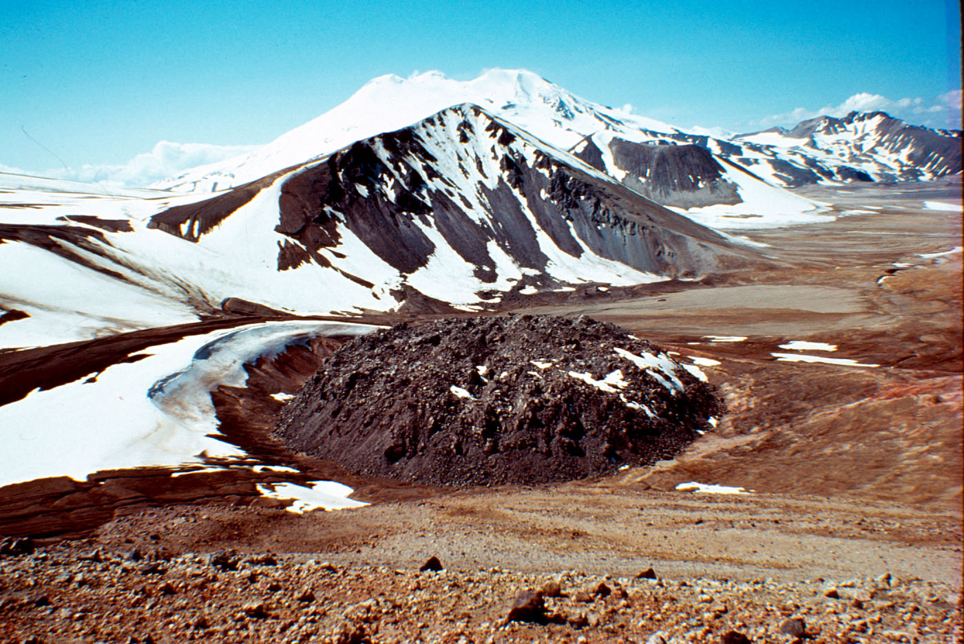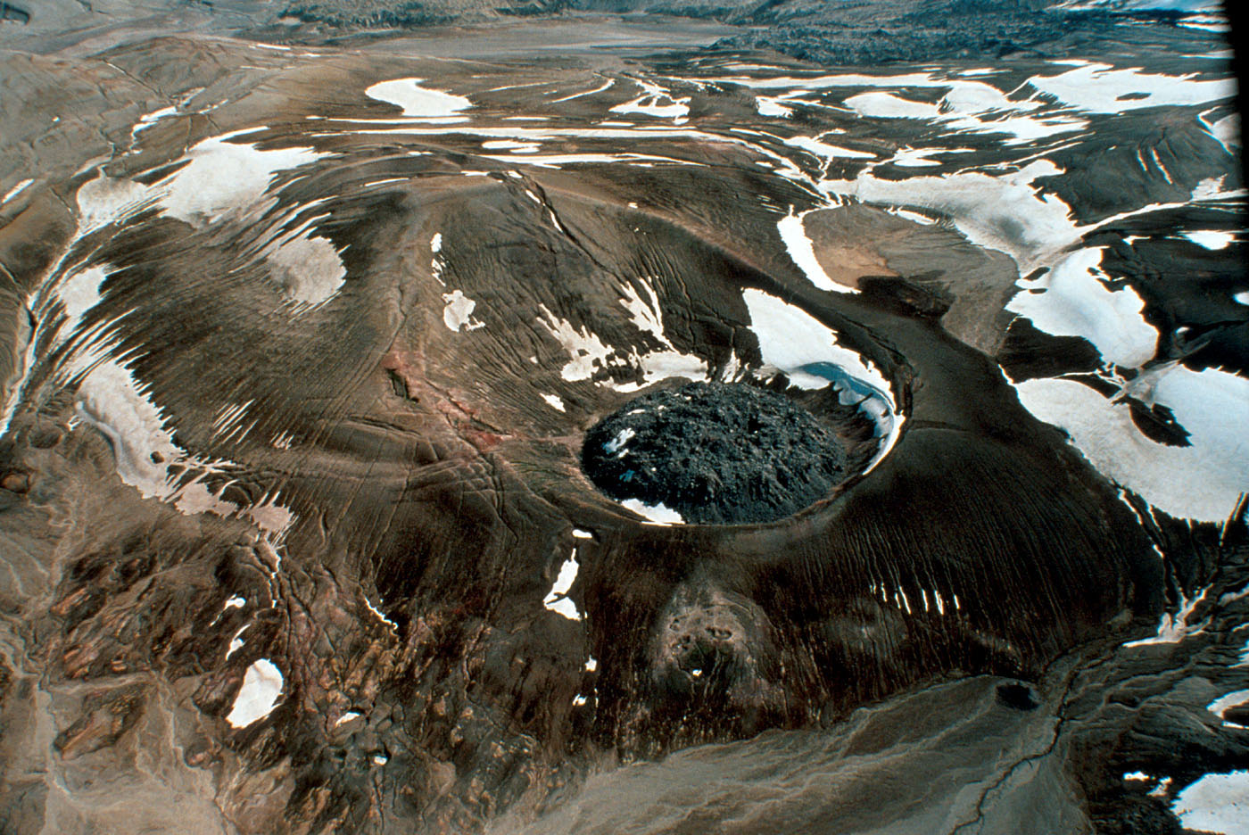 Katmai National Park and Preserve, Alaska. 80-meter (260-foot)high Novarupta, a blocky rhyolite lava dome that marks the vent for the June 1912 eruption that created the Valley of Ten Thousand Smokes. Surrounding the dome is an oval-shaped ring of coarse tephra that accumulated during the waning explosive phases of the eruption. Photo courtesy of C. Nye, Alaska Division of Geological and Geophysical Surveys, August 1991.