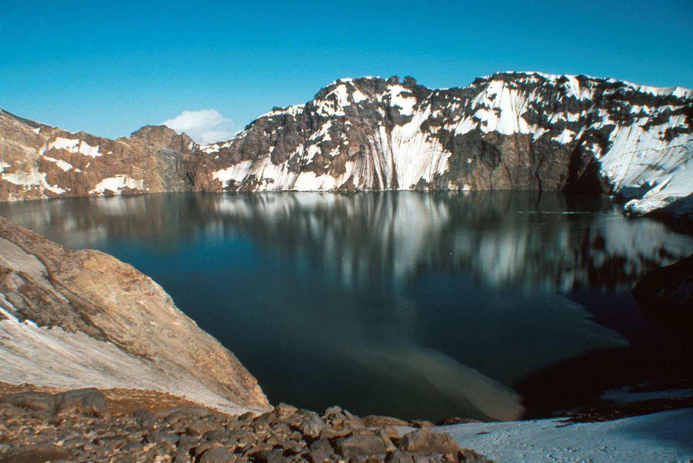 Katmai National Park and Preserve, Alaska. View from the west rim of Katmai Caldera, a collapse feature that formed during the catastrophic eruption of nearby Novarupta Volcano in June 1912, is a steep-walled, 1.5-kilometer (1 mile) diameter crater which truncates a formerly 2,290-meter (7,513-foot) high stratovolcano. The caldera is partially filled by a blue-green lake about 250 meters (820 feet) deep. The lake level was still rising when last measured in the mid-1970's. The east interior wall of the caldera is visible. Photo by R. McGimsey, July 16, 1990.